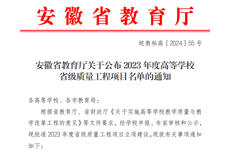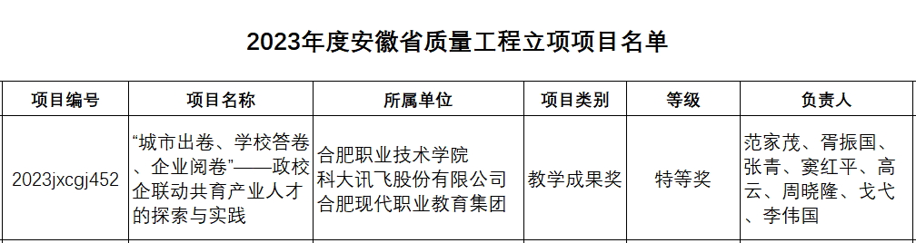 2024年6月,安徽省教育厅公布了2023年高等学校省级质量工程项目名单,我校与科大讯飞股份有限公司、合肥现代职业教育集团等单位联合申报的《“城市出卷、学校答卷、企业阅卷”——政校企联动共育产业人才的探索与实践》荣获特等奖。安徽省教学成果奖每两年评选一次,旨在奖励在教学实践、改革、研究中取得显著成果的单位和个人,发挥教学成果的引领示范作用。特等奖是安徽省教育教学领域的最高奖项,也是反映该校办学综合实力的重要体现。我校将进一步加大教学成果的培育力度和示范推广,提前谋划国家教学成果奖的组织与申报工作。