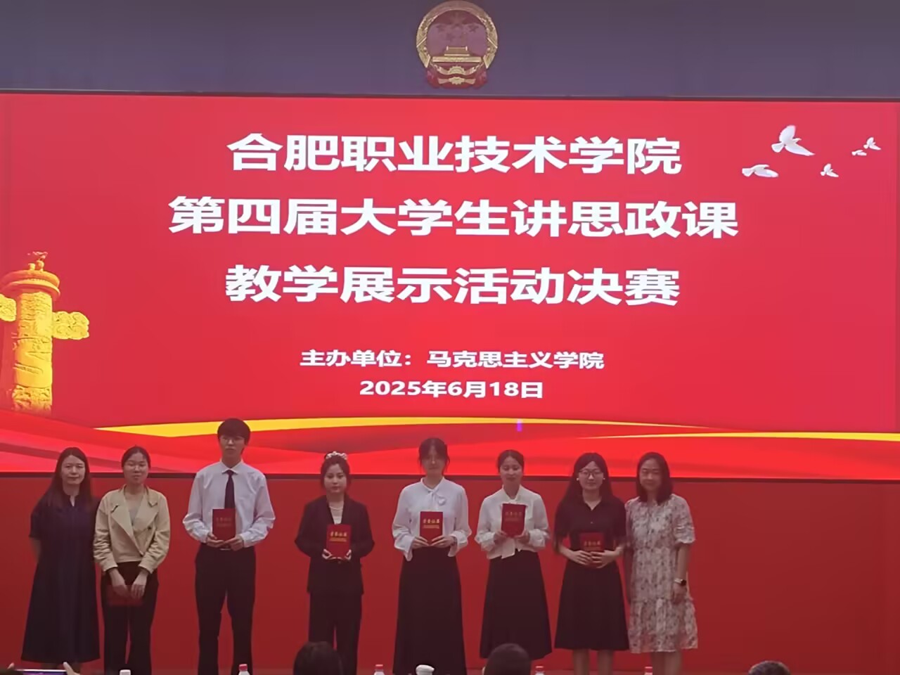 经过激烈角逐,本次比赛作品《“合肥改革之路——三次关键选择背后的方法论”》(主讲人:23运营班徐丹露、24运营班张欣悦、王诗宇、朱世斌)《为什么说“渡江战役是人民群众用小船划出来的”?》(主讲人:24车辆1班陆文仙、24运营班沈天龙、魏冰冰)荣获一等奖;作品《以格局之“新”,绘高质量发展之“美”》(主讲人:24物联网2班章倩岚)《讲家风故事,扬时代新风》(主讲人:24金融班杨帅、24旅馆2班韦佳延、24城轨机电吕安奇、24会计1班邓天宇)《解码新时代的温暖答卷》(主讲人:24数媒3班桂雪君)、《机械智控筑基石,乡村振兴绘新章》(主讲人:24机械1班栗家豪、24智控班李卓芳)荣获二等奖;作品《以斗争精神为炬 争做新时代先锋》(主讲人:24新能源汽检1班雷玉晴)《新质生产力破局药品卡脖子》(主讲人:24药学3班陶馨)《将小我融入大我——成就出彩人生》(主讲人:24医检1班铁静文)《承千年精粹,启治理新篇——以中华优秀传统文化筑牢基层社会治理“精神底座”》(主讲人:24计网班苏宁)《家·教·风》(主讲人:24建装1班董爱玲)《“以匠心,致初心”树立正确择业观》(主讲人:24焊接1班尤松)荣获三等奖。